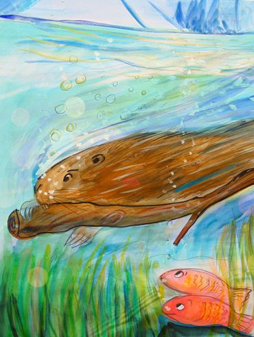 The beaver family that inspired the story still lives at Bowers Springs. This video of some of them was filmed August 2023 by Jocelyn Pyne.